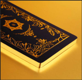 Printing: CMYK printing for the front, CMYK + gold foil printing for the back + gold foil edges